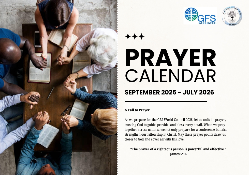 We are pleased to share with you the World Council 2026 Prayer Calendar put together by the World team (see attached). It starts in September and goes through to just after the World Council next year. Their hope is that this becomes a meaningful opportunity to unite in prayer as friends across our link groups, you may use the special World Council 2026 Prayer Calendar, along with your own country’s needs, GFS intentions, and personal prayer requests.